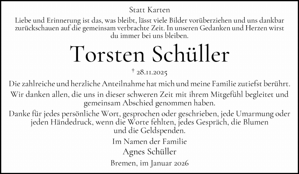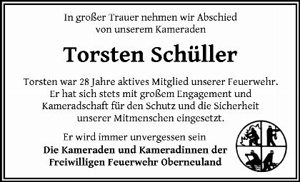 Anstelle von freundlich zugedachten Blumen und Kränzen bitten wir im Sinne von Torsten um eine Zuwendung an: Wildtierauffangstation Rastede e.V., Spendenkonto: IBAN: DE33 2805 0100 0043 3333 35, Landessparkasse zu Oldenburg, Verwendungszweck: Torsten Schüller.