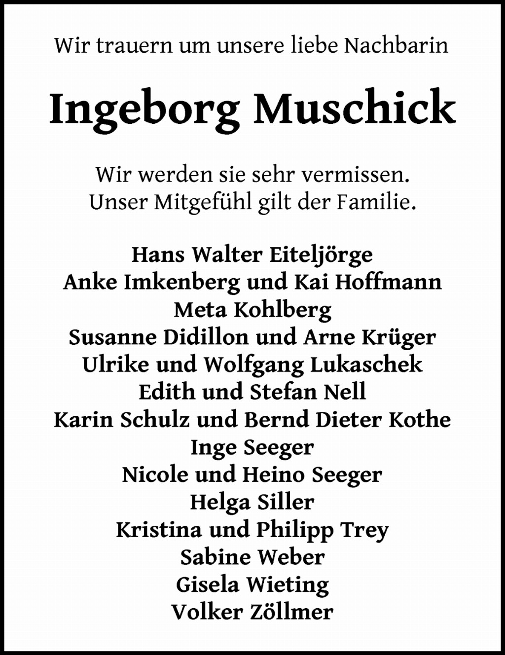 Liebe Angehörige, wir wünschen Ihnen von Herzen viel Kraft und dass Sie in dieser schweren Zeit von Menschen umgeben sind, die Ihnen Trost und Halt schenken. Nutzen Sie diese Gedenkseite, um Erinnerungen zu teilen und das Andenken gemeinsam lebendig zu halten. In tiefer Verbundenheit Ihre Familie Stubbe mit Mitarbeitern